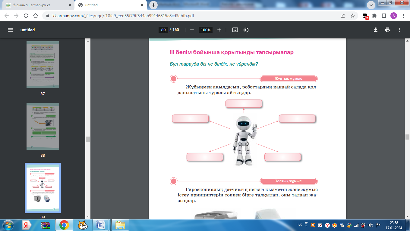 1. Ұйымдастыру кезеңі: Оқушылармен амандасып, олардың назарын сабаққа аудару, ынтымақтастық атмосферасын орнату. Оқушыларға ДОДОКАЭДР әдісі арқылы, тренинг өткізу 2. Топқа бөлу - USB флэш картасы арқылы 3.Wordwoll платформасы арқылы үй тапсырмасын сұрау. - Робот деген не? - Роботтардың қандай түрлерін білесің? - Өнеркәсіптік роботтар не үшін қажет? - Тұрмыстық роботтарға қандай техникалар жатады? - Ақпарат дегеніміз не? - Графиканың неше түрі бар? 4. Сабақтың тақырыбы мен мақсаттарымен таныстыру. |