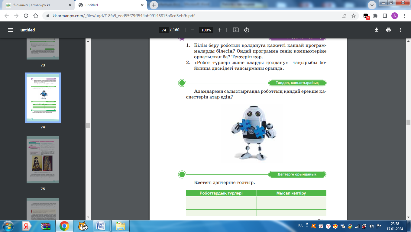 Дескриптор: - роботтардың қандай салада қолданылатыны туралы айтады. Топтық жұмыс. 3-тапсырма