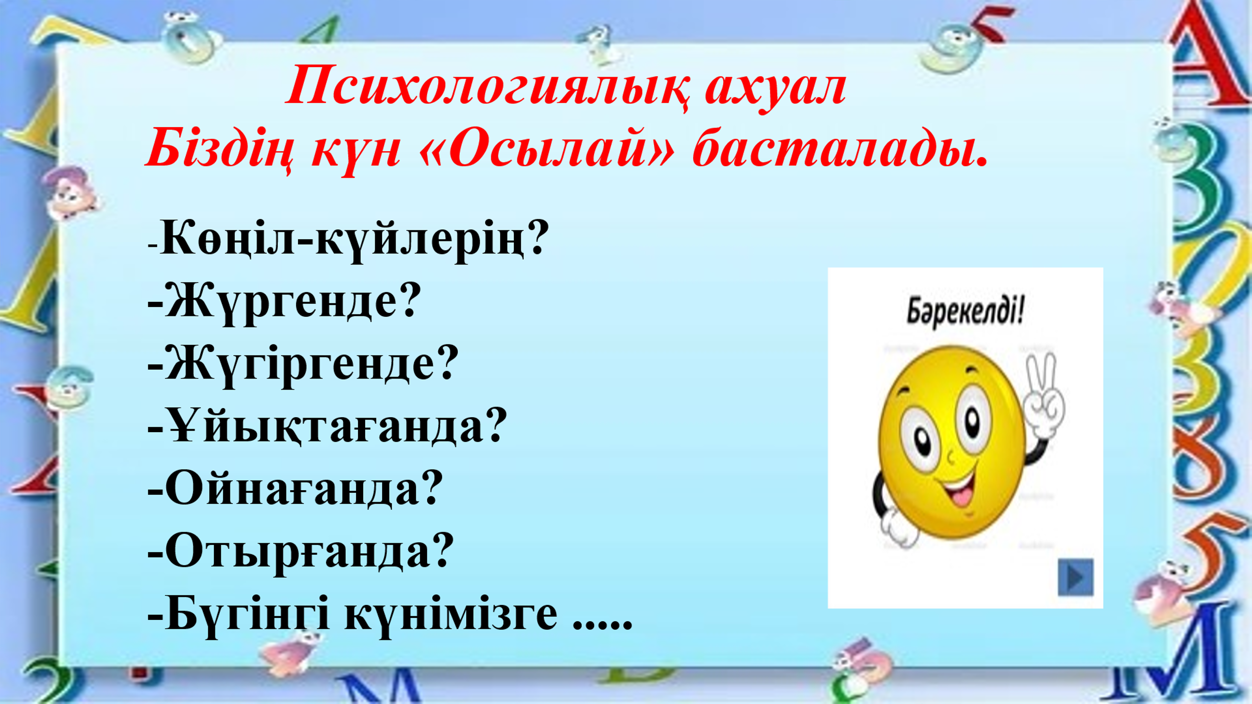 Әр буындағы дыбыстарды тұтастырып, «бір дыбыс» сияқты қосып, яғни дауыссыздан дауыстыға қарай және дауыстымен үндестіріп оқиды. Буындарды қосып сөзді оқиды Оқушылар жазу дәптеріндегі тапсырмалар ды орындайды Өлең жолдарын хормен оқып жаттайды Сұраққа толық жауап беруді үйренеді Әңгімелеуді үйренеді Оқушылар өздеріне берілген саралау тапсырмала рын орындайды. Қосымша жұмыс орындайды Топтық тапсырмалар орындайды Кері байланыс жасайды  |