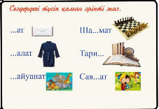 Дескриптор: Атауларын тауып жазады Сөз құрап жазады Сөздердегі түсіп қалған әріпті жазады. |
