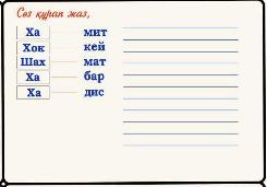 Дескриптор: - ретіне сәйкес әріптерді жазады -шыққан сөзді бүынға бөледі -дыбыстық талдау жасайды «Сөз тану» тыңдау материалымен жұмыс Мұғалімнің жаңылтпашпен жұмысты QR-пен тыңдату арқылы ұйымдастыруы. Сұрақ-жауап әдісі арқылы бүгінгі сабақта өтілген жаңа дыбыс пен әріп туралы оқушылардың білімін бекіту. Хакім хат ашып отыр Ол хатты қате ашып отыр Дескриптор: -жаңылтпашты жатқа айтады «Ұяшық таңдау» ойыны «Х» дыбысы кездесетін сөздерді оқы Дескриптор: Сөздерді оқиды |