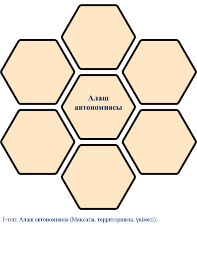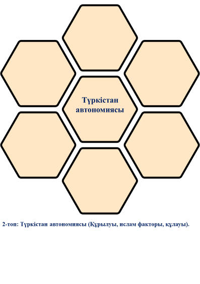 2-тапсырма. Топтық жұмыс. «Ара ұясы» әдісі. 1-топ: Алаш автономиясы (Мақсаты, территориясы, үкіметі). 2-топ: Түркістан автономиясы (Құрылуы, ислам факторы, құлауы).