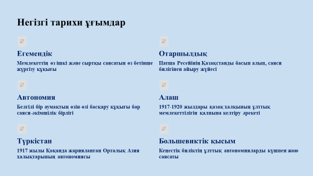Қазақстанның мемлекеттік егемендігінен айырылуының себеп-салдарын анықтайды. Қазақ халқының мемлекеттік егемендікті қалпына келтіру үшін жүргізген күресін зерттейді. Алаш және Түркістан автономияларының бағдарламаларын салыстырып, мемлекет құру жолындағы ерекшеліктерін анықтайды. |