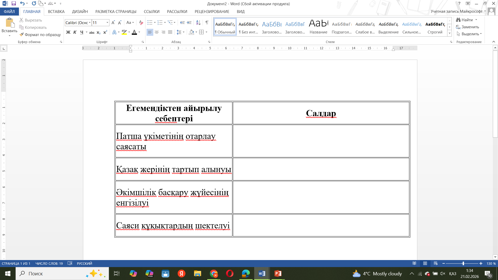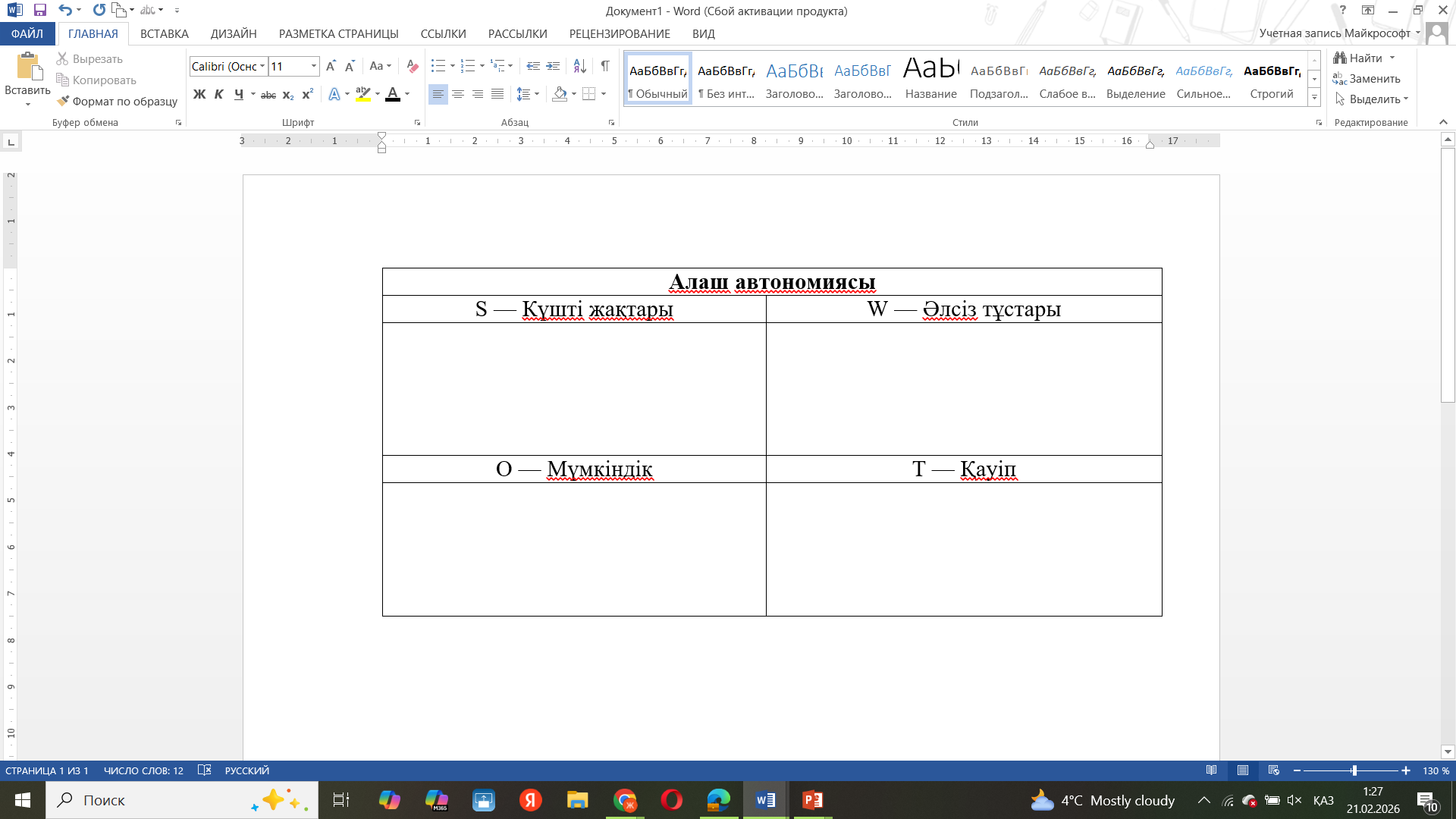 4-тапсырма. Жеке жұмыс «SWOT» талдау Берілген видеоматериалды тыңдаңдар. Тыңдалған ақпараттар негізінде Алаш автономиясына талдау жасаңдар.