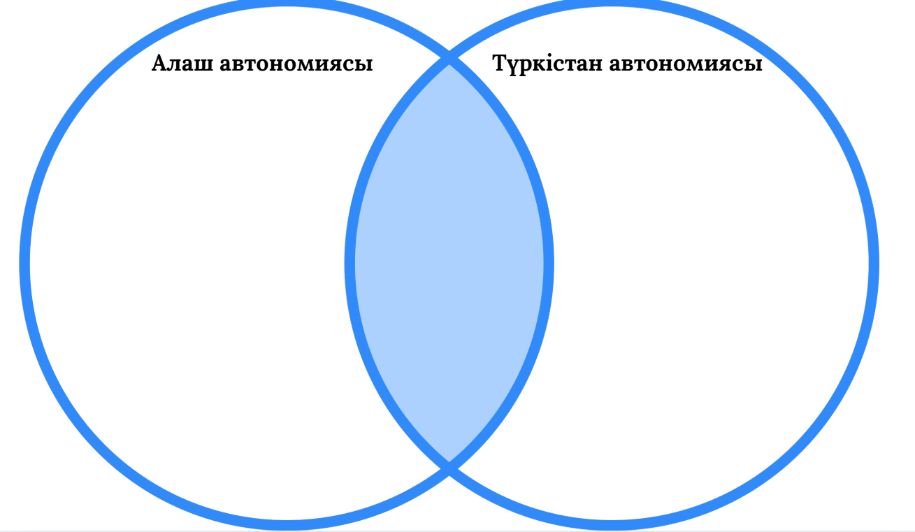 3-тапсырма. Жұптық жұмыс Венн диаграммасы Алаш автономиясы мен Түркістан автономиясының егемендікті қалпына келтірудегі ұқсастықтары мен айырмашылықтарын анықтаңдар.