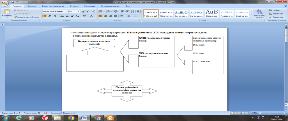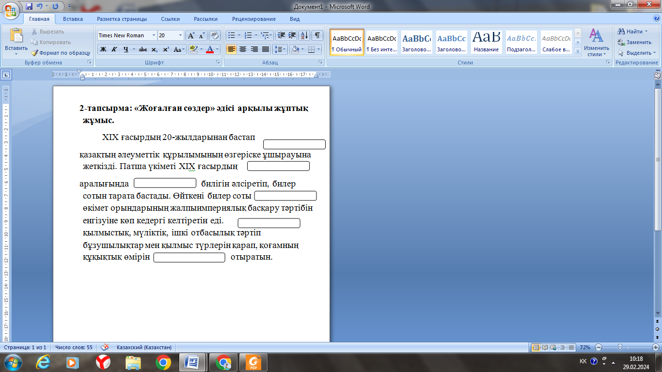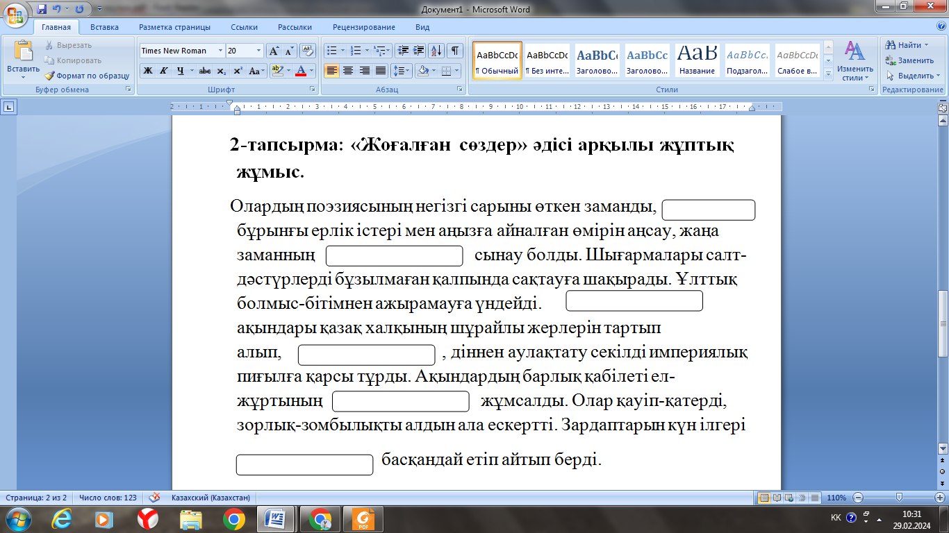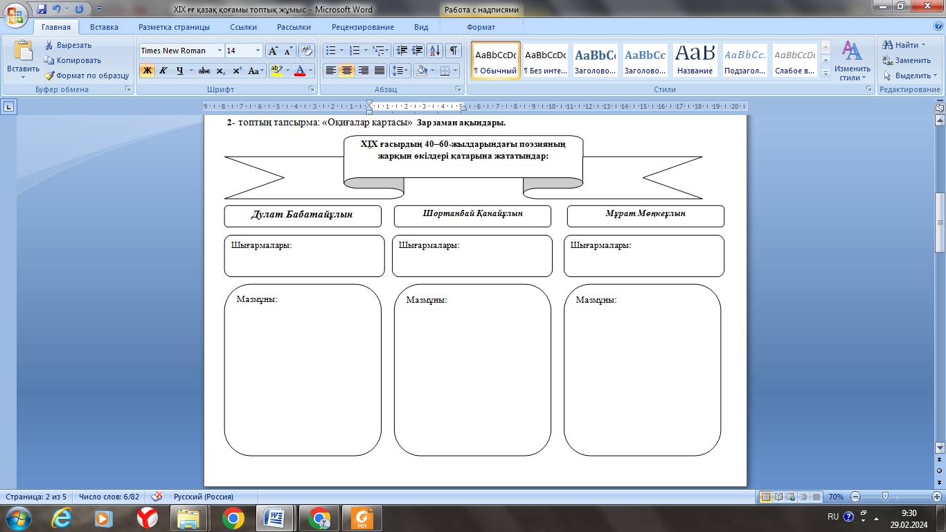 Оқушылар интерактивті тақтадан тақырыпқа байланысты бейне баянды қарап шығады, қажетті мәліметтерді дәптерлеріне түртіп алып отырады. Топпен тапсырмаларды орындайды Оқушылар «зар заман» ақындарының қалыптасуына әсер еткен факторларды анықтап, оларды кестеге топтастырады. Өз ойларын екі-үш сөйлеммен жазбаша түрде қорытындылайды. Тапсырманы топпен орындайды ЕБҚ: оқушыға тапсырманың нақты бір бөлігін ерекшелеп көрсетіп беріледі. Мәтінді оқушылар жұппен орындайды. Бос орындарға қажетті сөздерді жазады Мәтінді оқып, берілген сұрақтарға жауап береді? . |