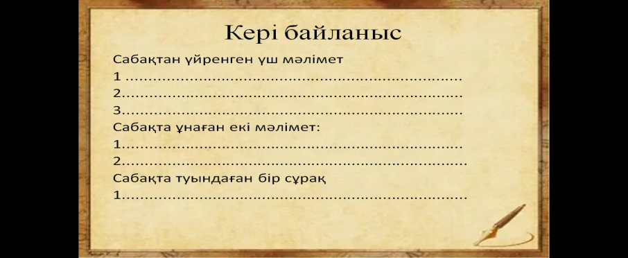 Бүгінгі сабақтан үйренген үш мәліметті, ұнаған екі мәліметті және бір сұрақты жазады |