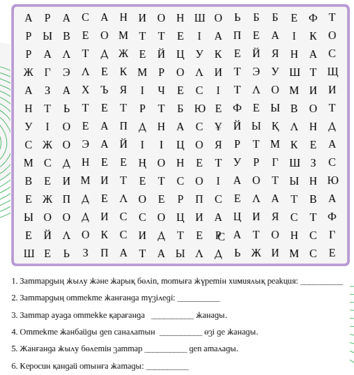 Тапсырманы жұппен орындайды. Берілген 6 сұраққа алдымен жауап жазады, содан кейін анықталған жауаптарды филворд ішінен ерекшелеп белгілейді. Жұптар бір – бірінің жұмыстарын алмастыру арқылы тексереді.