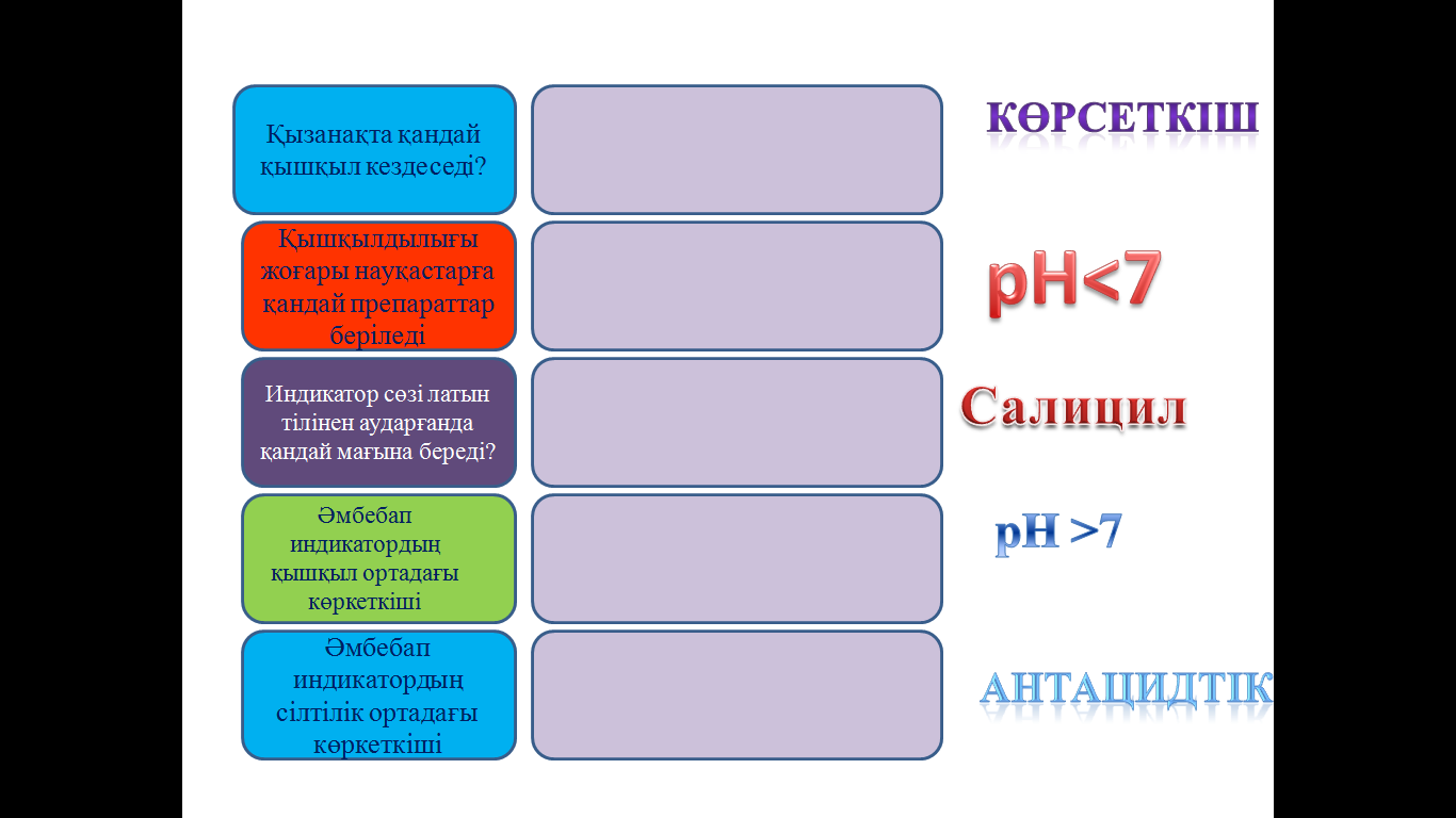 Ұжымдық жұмыс Қышқыл ерітінділерінің қышқыл дәмі болады. Мысалы, көптеген жемістердің дәмінің қышқыл болуы құрамында қышқылдардың кездесуіне байланысты. Цитрус жемістері – грейпфрут, апельсин және лимонда лимон және аскорбин қышқылдары бар. Кез келген қышқылдың дәмін көруге болмайды. Олардың арасынла улы қышқылдар болуы мүмкін. Оларға күкірт қышқылы, азот қышқылы, тұз қышқылдары сияқты минералды қышқылдар жатады. Қышқылдардың күйдіргіш және уландырғыш қасиеттері бар. Сілтілер – көптеген органикалық заттарды күйдіретін заттар. Олармен жұмыс істегенде қауіпсіздік техникасы ережелерін қатаң сақтаған жөн. Сілті ерітіндісі қолға сабын тәрізді білінеді. Сілтілерге құрылыс әгі – кальций гидроксиді, натрий гидроксиді, калий гидроксиді жатады. Қышқыл және сілті ерітінділері әсіренен түсін өзгертетін заттар – индикаторлар деп аталады. 1-ші тапсырма Топтық жұмыс «Компьютер» әдісі 1-топ Қышқылдар дегеніміз не?Медицинада қолдану аясын табыңдар. 2-топ Сілтілер дегеніміз не? Қандай сілтілерді білесіңдер? 3-топ Индикатор деген не? Сілті мен қышқыл ерітінділерінің индикаторларға әсері қандай? 2-ші тапсырма Жұптық жұмыс «Аквариум» әдісі Сәйкестендіру