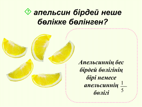 Оқылуы: Апельсин бес қатысушыға тең бөліп берді. Әрқайсысына қанша бөліктен келді?