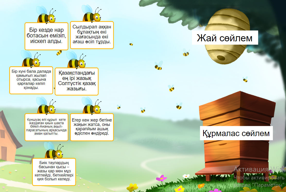 Әңгіме құрайды, ортада бөліседі. Топта бірлесе жұмыс жасайды. Дескриптор: - Сөзге қосымшалар жалғауда буын және дыбыс үндестігін ескеріп қолданады; -жай сөйлемдер мен құрмалас сөйлемдерді қатыстырып, әңгіме құрайды. Құпия сыйлық ойынын ойнайды. Берілген мәтінді тыныс белгілерін қойып, көшіріп жазады. . Дескриптор: 1. құрмалас сөйлемдердің тыныс белгісін қояды, көшіріп жазады. Жай сөйлемдер мен құрмалас сөйлемдерді ажыратады. |