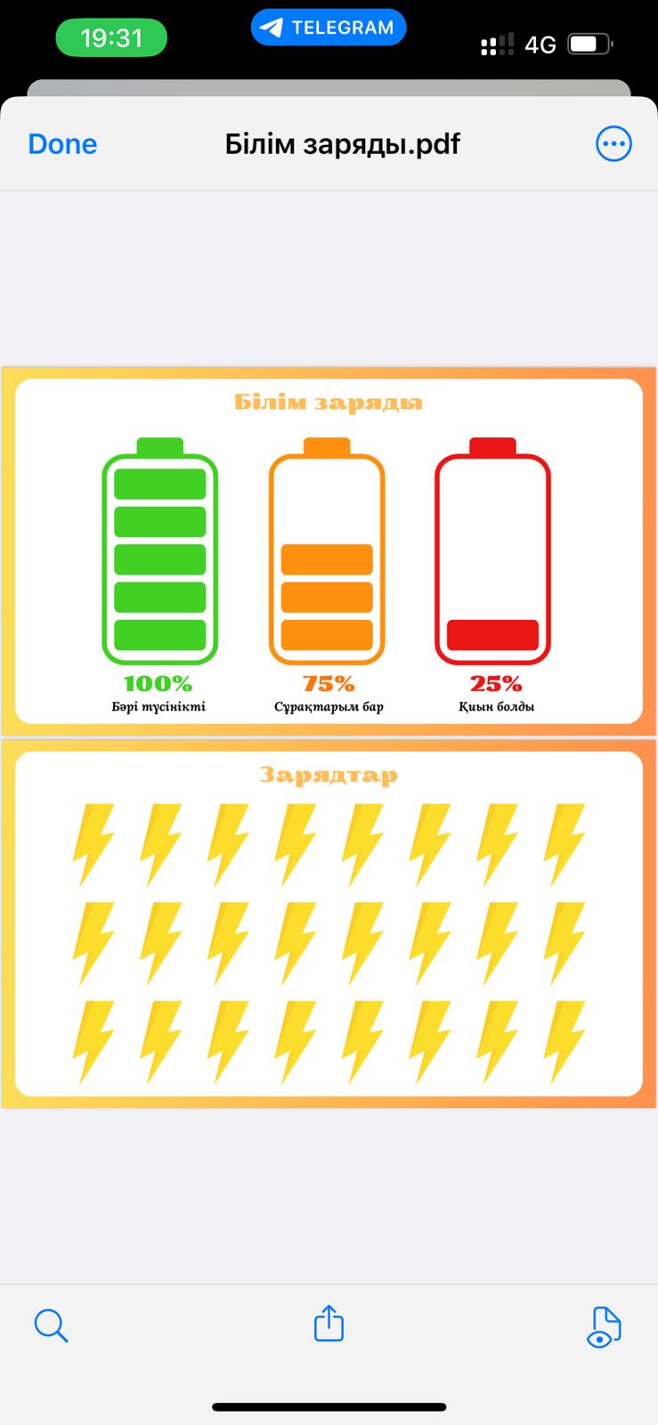 Оқушыларға сабақ ұнаса және бәрі түсінікті болса, заряд стикерін жасыл батареяға жабыстырады Егер сабақта белгілі бір қиындықты кездестірген және сұрақтары бар болса, сары түсті батареяға заряд стикер жабыстырады. Егер сабақ барысында тапсырмаларды орындау қиын болып, әлі толықтыру қажет болса стикерді қызыл түсті батареяға жабыстырады. |