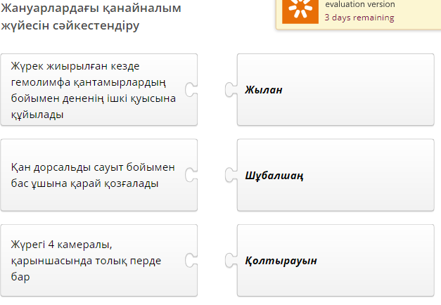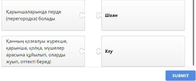 Дескриптор: Жануарлардың қанайналым жүйесінің маңыздылығын түсіндіреді. Ағзалардың қанайналым жүйесінің ерекшіліктерін айтады. Жануарлардың жүрегінің және қан тамырларының құрылысын сипаттайды. Қалыптастырушы бағалау Топ өзара бармақ әдісімен бағалайды.
