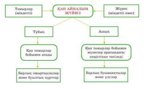 - Дұрыс қорытынды жасай отырып, қанайналым жүйесінің маңызын түсіндіре алады. - Жануарлардың қан тамырларының және жүректің құрылысын дұрыс сипаттай алады. - Қан тамырларын және жүректің оң және сол жақтарын ажырата алады. |