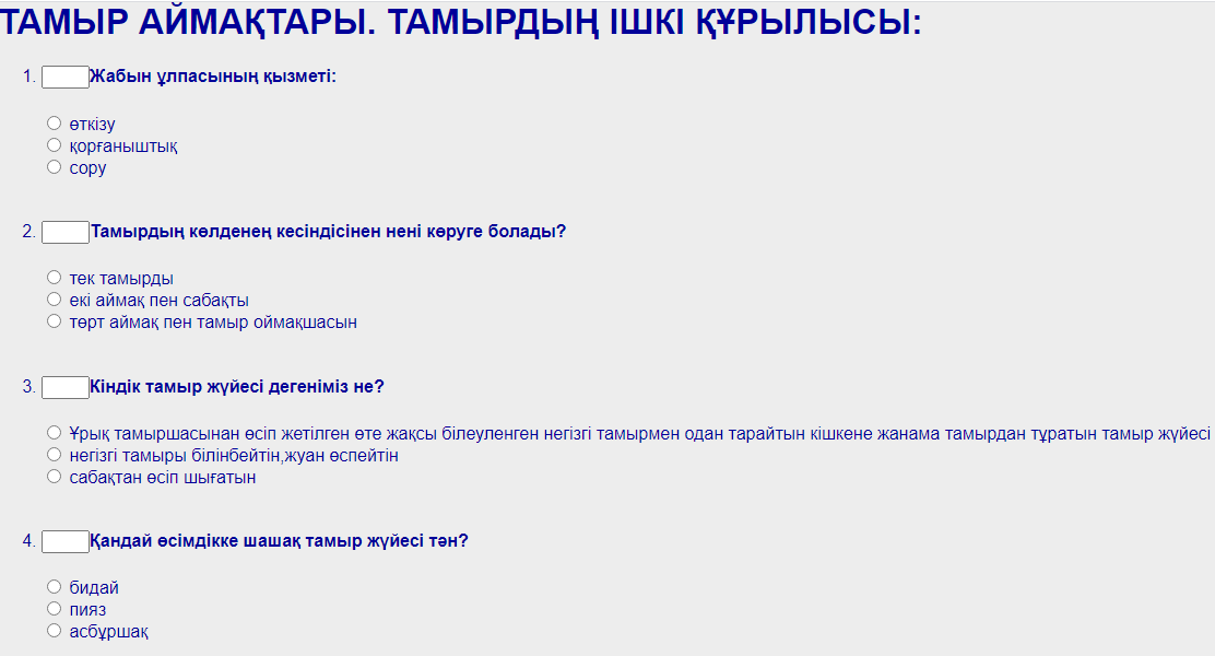 Ұйымдaстыру кезеңі: Психологиялық сәт: Сәлемдесу- игі дәстүр киелі, Сәлем сөзге күн күлімдер көктегі. Жақсы сөзбен жан жылуы төгілсін, Амандасып алайықшы, біз, кәне Сәлемдесу, оқушыларды түгелдеу. Үй тапсырмасын тексеру: HTML тілінде «Лездік тест» әдісі арқылы.