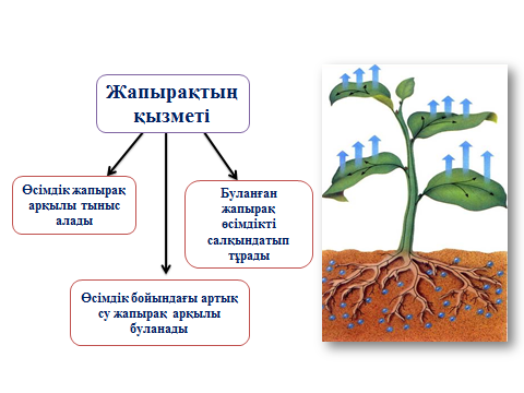 Жапыраққа су, еріген тұздар сабақ арқылы тамырдан келеді. Жапырақ арқылы өсімдік тыныс алады. Күн сәулесі мен жылуы арқылы жапырақта ауа мен судан қант пен крахмал жасалады.. Жапырақтың пайдасы ол ауадан көмір қышқыл газды сіңіреді де ауаға қажет оттегін шығарады. Сондықтан ауамызды тазарту үшін ағаштарды өсірудің пайдасы мол.