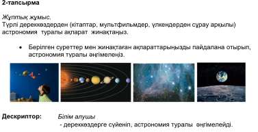 МК (модельдік айтылым мен оқылым): астрономия,шоқжұлдыздар туралы мағлұмат айту,оқу «Бақылау» әдісі (Ұ) (МК) Арнайы құралдардың көмегінсіз түнгі аспаннан нені көруге болады? (ҚБ) Дескриптор: *Жай көзбен көрінетін аспаннан жұлдыздары туралы айта алады; * шоқжұлдыздар ұғымын түсінеді. «Зерттейік» әдісі –топтық жұмыс Аңыздар кітабын дайындау үшін бірнеше шоқжұлдызды таңдап алу. Шоқжұлдыз туралы аңыз оқу.Қажетті мәліметтерді жинап, суретін салып, мұқабасын жасау. (ҚБ) Дескриптор: *Шоқжұлдызды таңдай алады; ажырата алады. *Мәлімет жинап, сурет салып, мұқабасын жасай алады. (Т) «Сен білесің бе?» әдісі