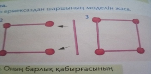2-тапсырма Дәптермен жұмыс. «Ұқсастықты тап»ойыны.Әрбір қатардан бірінші бағандағы заттарға ұқсас фигураны бояу. « Смайлик»арқылы бағалау Сергіту сәті Орнымыздан тұрамыз, Алақаңды ұрамыз. Бір отырып, бір тұрып, Тез шынығып шығамыз. 3-тапсырма. «Миға шабуыл»әдісі /Т.Ж/Жазық пішіндерді құрастыруға арналған тапсырма. 1.7 таяқшадан 2 бірдей тік төртбұрыш құраңыз. 2.5 таяқшадан 2 бірдей үшбұрышты құрастыру 3.10 таяқшадан 2 тік төртбұрыш құрастыру/кіші тіктөртбұрыш үлкен тіктөртбұрыштың ішінде екі таяқшадан құрастырылады. 4.7 таяқшадан 3 үшбұрыш құрастыру. «Температураны өлшеу» әдісі бойынша бағалайды. 4-тапсырма. «Данышпан суретші»әдісі./Ж.Ж/Қалыптастырушы бағалауға арналған тапсырмалар. Ж Дескриптор:-жазық фигураларды анықтайды. -кеңістік денелерді анықтайды. |