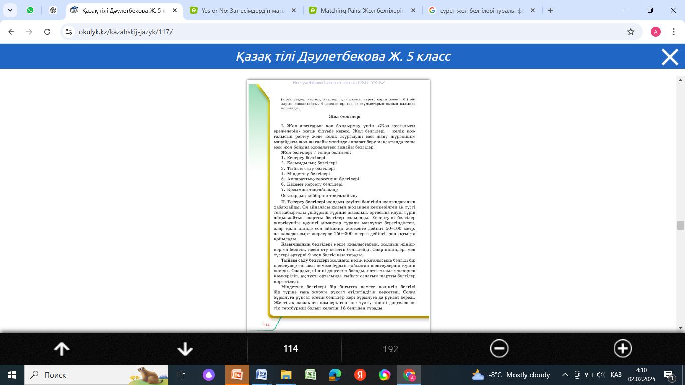 5. 2. 5. 1 мәтін мазмұнын түсінуге, нақты ақпараттарды анықтауға бағытталған сұрақтар құрастыру; 5. 4. 4. 4 сын есімдердің тұлғалық түрлерін ажырата білу; |