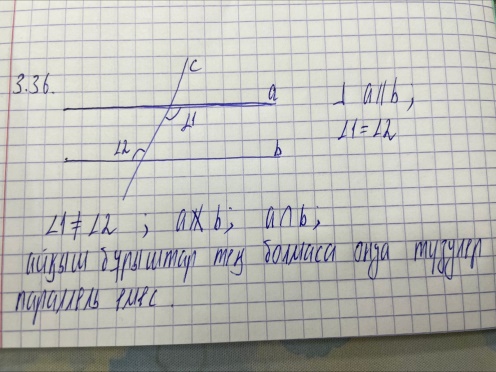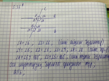 3.35- есеп Дескриптор: -ішкі айқыш бұрыштарды, сәйкес бұрыштарды, ішкі тұтас бұрыштарды табыды (0,5 бал) -Екі түзудің параллель екенін жазады.(0,5 бал) 3.36- есеп Дескриптор: -Бұрыштардың тең емес екнін көрсетеді.(1 бал) -Екі түзудің қилысатынын жазады..(1 бал) Дескриптор: Миға шабуыл сұрақтарына дұрыс жауап берген оқушыға1 бал |