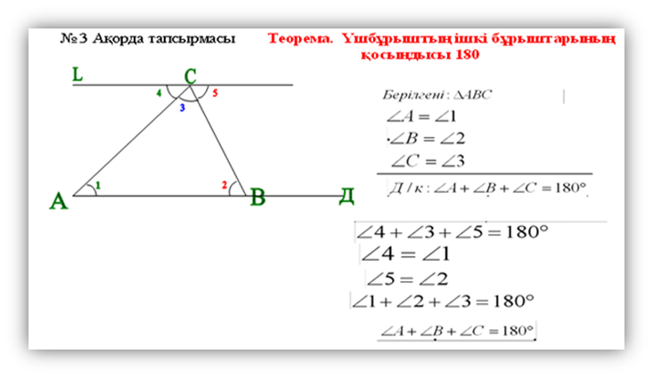 Жаңа тақырыпқа көшу: Жаңа сабақ тақырыбын айту Оқу мақсатымен таныстыру, Үшбұрыш бұрыштарының қосындысы Теорема. Үшбұрыш ішкі