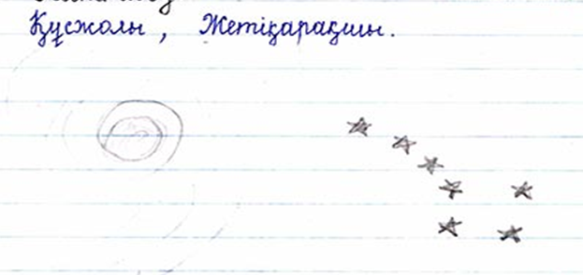 күткен. Сол себепті қазақтар Үркер аспанда анық көрінсе, онда күн суытып, алда аяз күтіп тұр деген болжам жасаған. Ал егер Үркер түнгі 11-12-де аспанда анық көрініп тұрса, онда көктем туады деген түсінік болған. Егер Шолпан жарқын болса, онда жазда өсімдіктер көп болады деп болжаған. «Құрастыр» айдары Құсжолын, Жетіқарақшыны тақтаға және дәптерге сызу.