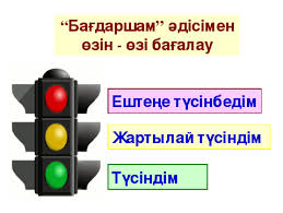 Тамаша тілектер айттыңдар! Дескриптор: Оқушы сұрақтарға жауап береді Өтілген тақырыптарды біледі Жұлдызшалар арқылы бағалап отыру Дескриптор 1.Жуан дауыстыларды бір топқа 2.Жіңішке дауыстыларды бір топқа топтастырады. Қ.Б.»Жұлдызшалар» Дескриптор: «Сыйлаймын» деген сөзді қалай түсінетіндерін айтады. Сөздің мағынасын біледі. Дескриптор: Өлең соңындағы сұрақтарға жауап береді. Өз бойларында да осындай жақсы қасиеттердің болуын әңгімелейді. Дескриптор: Тыйым сөздерді түсініп оқып, көшіріп жазады. Берілген сөздердегі дауысты дыбыстың жуан, жіңішке екенін айтады. Дескриптор: Сөздерді көркем жазу емлесін сақтай отырып жазады Дәптермен жұмыс жасау жолдарын біледі Қ.Б. Жұлдызшалар Дескриптор: Суреттердің атауын сәйкестендіріп айтады. Осы сөздерді қатыстырып, сөйлем құрап жазады. Қ.Б. Жұлдызшалар Дескриптор: Сөздердің жуан немесе жіңішке айтылып тұрғанын табады. Буын санын анықтайды. Қ.Б. Жұлдызшалар Дескриптор: 1.Сөздерді оқиды. 2. Жуан және жіңішке дауысты дыбыстар қатар келген сөздерді анықтайды. Қ.Б. Жұлдызшалар «Бағдаршам» әдісі |