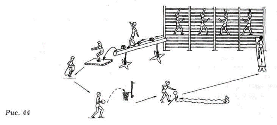 Гимнастикалық төсеніштер, орындықтар, бөрене, секіргіштер, доптар
