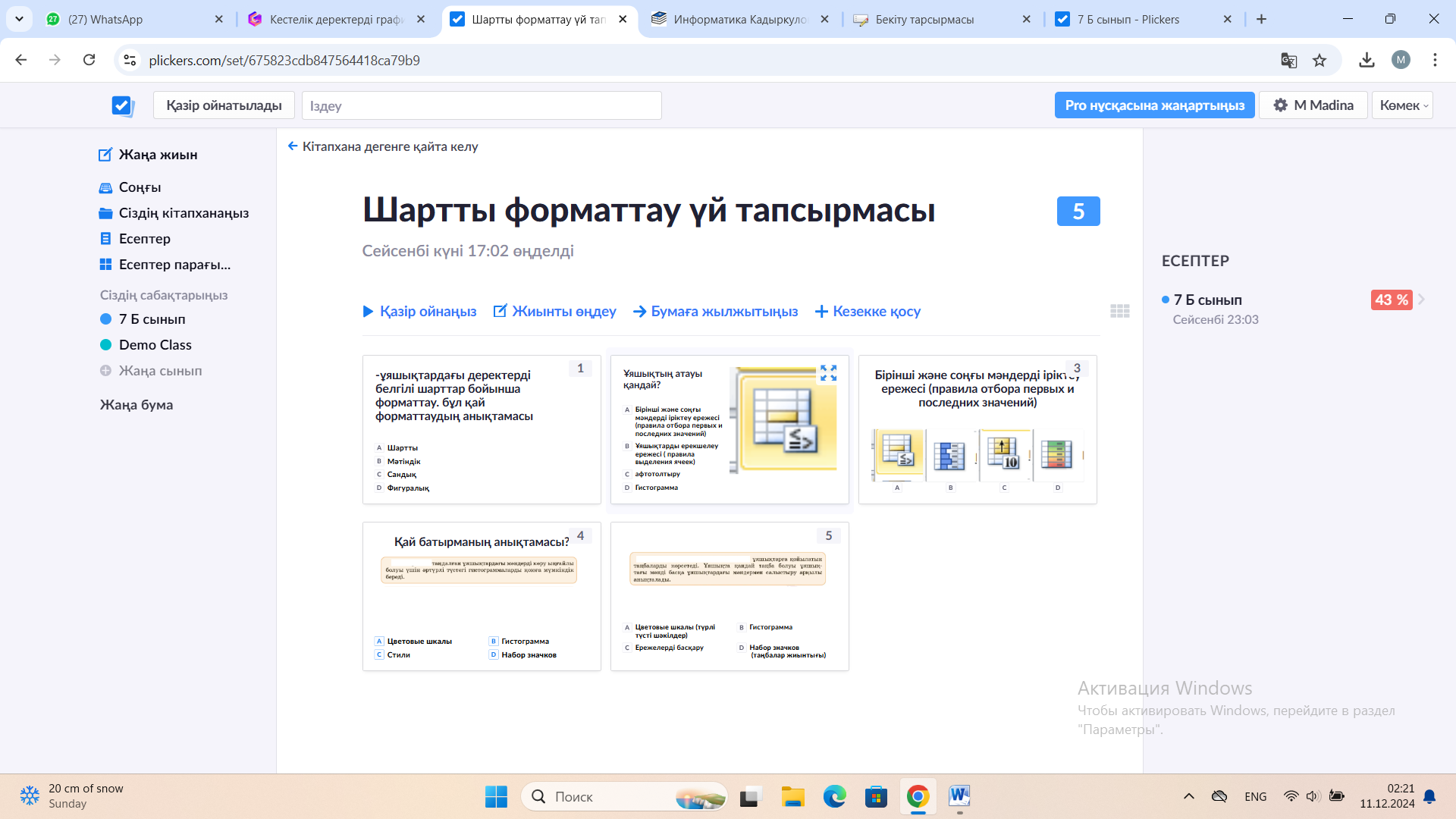 «Біртұтас тәрбие» тәрбие бағдарламасындағы «Тәуелсіздік және Отаншылдық» құндылығы • Халықтың өткеніне, бүгініне және болашағына қатыстылығын түсіну «Plickers» платформасы арқылы арқылы үй тапсырмасын пысықтау. 1. -ұяшықтардағы деректерді белгілі шарттар бойынша форматтау. бұл қай форматтаудың анықтамасы 2. Ұяшықтың атауы қандай? 3. Бірінші және соңғы мәндерді іріктеу ережесі (правила отбора первых и последних значений) 4. Қай батырманың анықтамасы? 5.