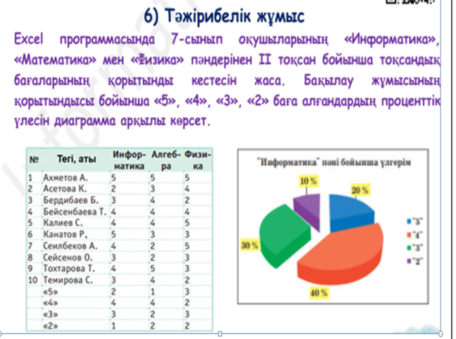 «Лүпіл» бағалау шкаласы арқылы балл жинайды. Дескриптор: -үлгі бойынша кесте құрады; -диограмма бөлімінен гистограмма командасын орындап, диограмма құрады Жалпы – 2 балл |