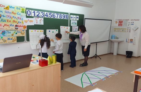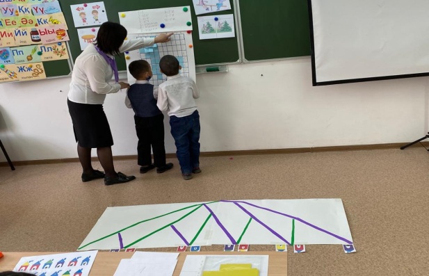 Тақтада берілген үлкен торкөздермен үш плакат ілінеді.Онда торкөздер сызылған, жоғарда әріпер жазылып тұрады, төменде сол әріптермен сәйкес келетін цифрлар көрсетілген .