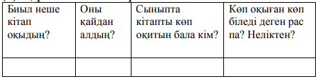 «Жаңа сөздер сандығы» айдары бойынша күзге қалу сөз тіркесінің мағынасын ашады. Күзге қалу – үлгерімінің нашарлығына байланысты келесі сыныпқа көшіру үшін емтихан тапсыру. «Сұрақтар жаңбыры» әдісі 1. Бала өз басынан өткен қандай оқиғаны ұяла есіне алды? Әңгімелеп бер. 2. Оқыған кітаптары оны қандай жақсы қасиеттерге баулыды? (сауаттылыққа, алғырлыққа,жақсылыққа , қамқорлыққа баулыды) 3. Анасының баласына қаталдығы, қамқорлығы дұрыс па? Неліктен екенін түсіндір. 4. Кітапқұмар бала туралы оқығаныңды есіңе түсір. (Әже, «Қобыланды батыр», ақындар,...) ЕҚБмен ЕБҚ «Сөйлесейік» айдары бойынша шағын жұптағы оқушылар «Кітапханаңда қандай кітаптар болғанын қалайсың?» деген сұрақ төңірегінде әңгімелеседі |