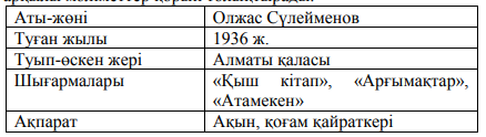 Олжас Сүлейменов- ақын, 1936 жылы Алматы аласында дүниеге келген. О.Сүлейменов шығармаларын орыс тілінде жазады .Оның көптеген өлеңдері қазақ тілінде аударылған.Ақынның «Қыш кітап», «Арғымақтар», «Атамекен», т.б кітаптары бар.