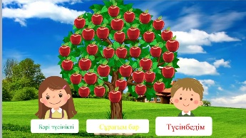 Жаттығу жасайды Ертегі мазмұнын айтады Тышқан қыздың жолын сызбамен көрсетеді Сұраққа жауап береді Оқушылар өз болжамдарын айтады Сұрақтарға жауап береді Өз ойын болжайды,топта талқылайды Өз ойын айтады Автормен таныстыру Өлеңді рөлге бөліп оқиды Сергіту сәтін жасайды Жаңа сөзбен танысады Дәптерге көшіріп жазады Кейіптеу тәсілімен суреттелген кейіпкерді анықтайды. Жұмбақты шешеді Шешуіндегі заттың суретін салады Есте сақтайды Жаттығу жасайды Сурет бойынша кез келген бір жеміс туралы әңгіме құрайды Үй тапсырмасын алады,мұғалімнің түсіндіргенімен орындайды Кері байланыс жасайды |