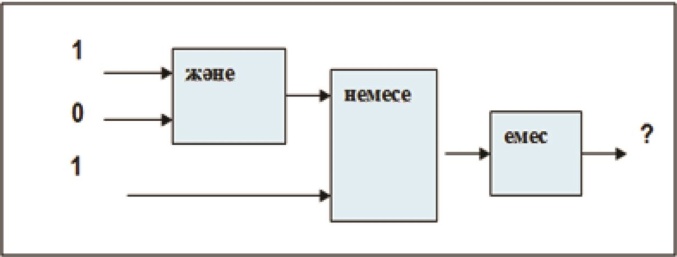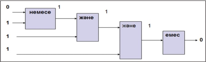 2-мысал.Емес (1 және (0 немесе 1) және 1) өрнегінің логикалық элементтерінің сызбасын құрып, мәнін тап. Шешуі: Есептеу ережесі бойынша бірінші жақша ішіндегілер орындалады.