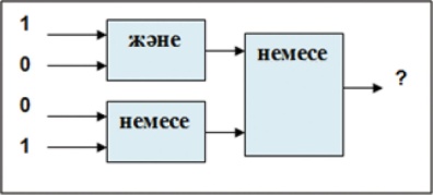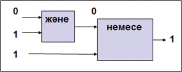 Компьютердің логикалық элементтерінің құрылымдық сұлбасы арқылы логикалық өрнектен схема құруды түсіндіру Есептерді шешу жолдары1-мысал. 1 немесе (0 және 1) логикалық өрнегін есептеу үшін, логикалық операциялар тізбегін көрсететін сызбаны сал. Сызбаға сәйкес логикалық өрнектің мәнін есепте. Шешуі: 1 немесе (0 және 1) = 1 немесе 0 = 1 (1-кестедегі конъюнкция бағанының 2-қатары және дизъюнкция бағанының 2-қатарындағы сызбаны пайдаландық).