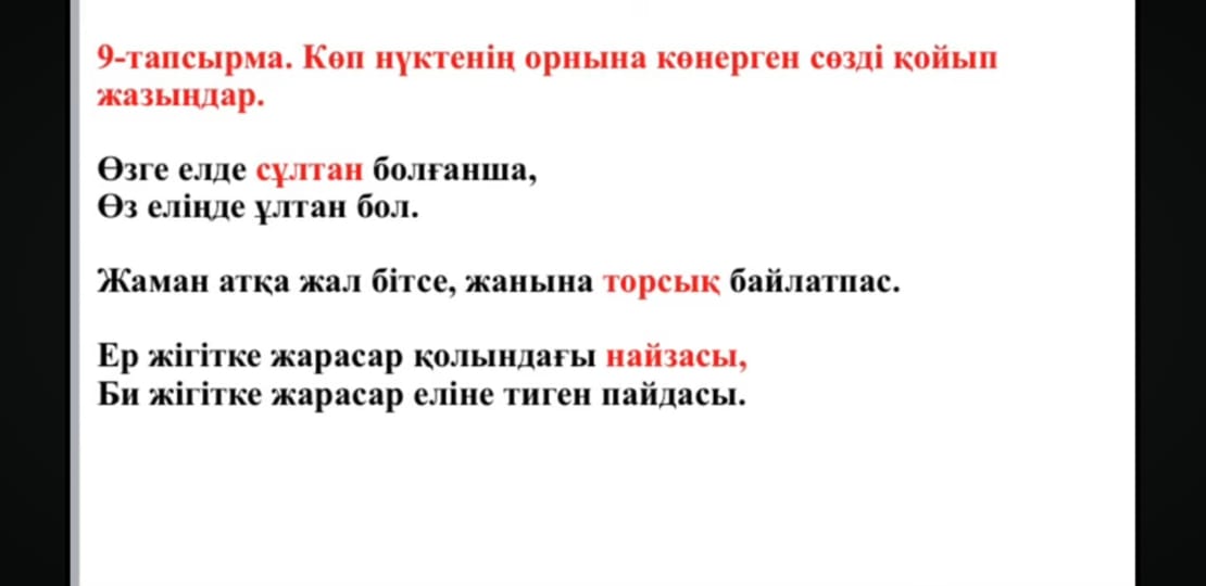 9-тапсырма Көп нүктенің орнына көнерген сөздерді қойып жазыңдар. |