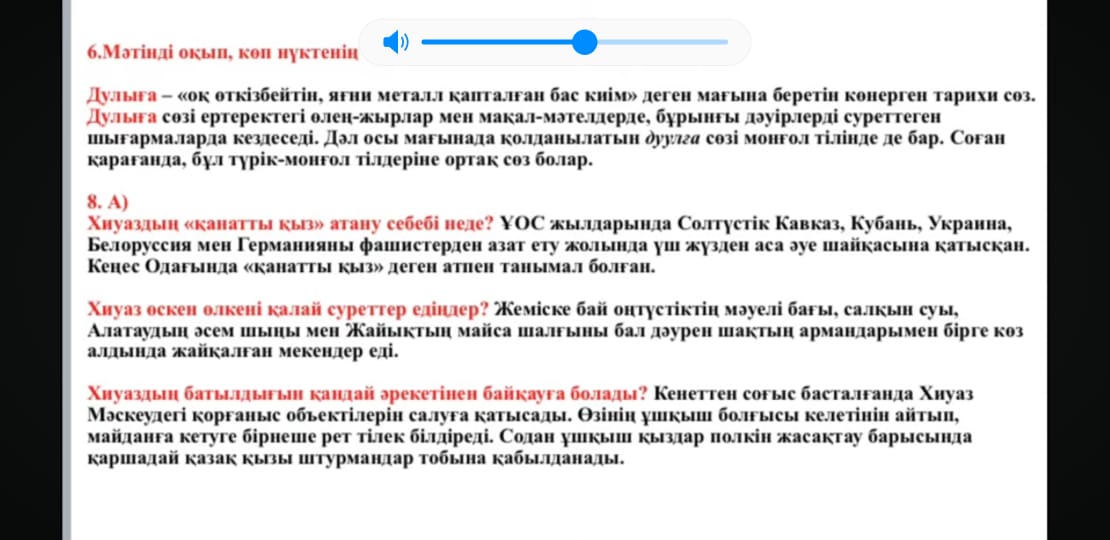 8-тапсырма: Мәтінмен жұмыс. Қаһарман қыз-Хиуаз Мәтінді оқы. А.Мәтін мазмұны бойынша сұраққа жауап беріп,негізгі ойын анықтаңдар. |