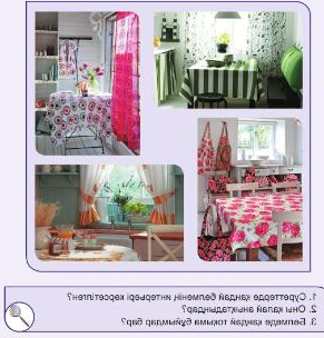 1. Суреттерде қандай бөлменің интерьері көрсетілген? 2. Оны қалай анықтадыңдар? 3. Бөлмеде қандай тоқыма бұйымдар бар? Оқушылар сұрақтарға жауап беріп, өзара талқылау жасағаннан кейін мұғалім оқушыларға сабақтың тақырыбы, мақсатымен таныстырады |