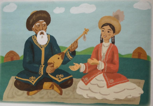 3-тапсырма. Жұппен жұмыс. 1.Суретте не көріп тұрсың? 2.Бұл суретте қандай ұлттық-мәдени элементтер бар? 3.Домбыра мен ұлттық әндерді қазіргі заманғы музыкаға қалай енгізуге болады? 4.Ұлттық күйлерді сақтау үшін қандай заманауи технологиялар тиімді? 5.Суреттегі кейіпкерлердің диалогін құрастыр.
