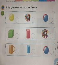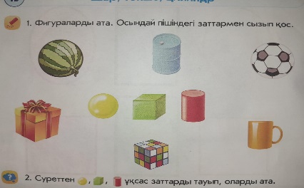 Суретті көрсетіп, балаларға пішіндердің атын айтқызу. Әліппе-дәптер мен Жеке жұмыс. Дидактикалық ойын: «Неге ұқсайды?» Суреттерге қарап, балалар Шарты:заттар қандай денеге ұқсайтынын айту. Шар , текше , цилиндрді ұқсас затттарды тауып, сызып қосу керек.