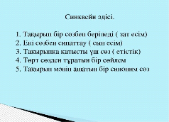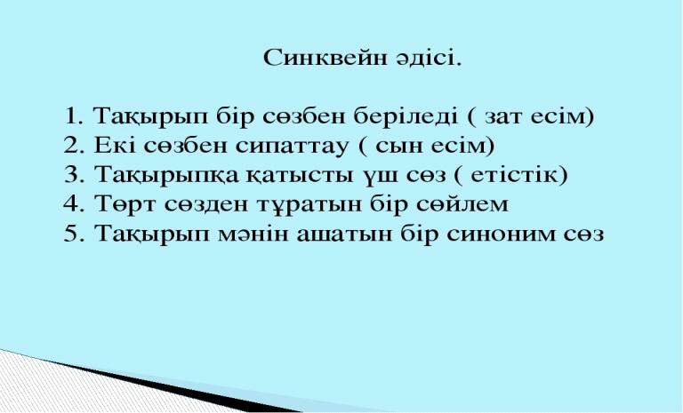Топтық жұмыс 1-тапсырма: Поэмадан берілген эпизодтарды қолдана отырып, Баянның тұлғалық болмысына талдау жасаңыздар. Бұл топтық жұмыста әр топқа ресурстар ұсынылады, түрлі әдістер арқылы көркем шығарманы талдайды. І деңгей 1-топ Мәтіндік талдау. Көркем туындыны толық, жан-жақты тұтастай қарастырып талдайды. Шешуші бір эпизодтар,не суреттеу, баяндау, кейіпкер монологі, сөйлеу тілдері негізге алынады. Бұл талдаудың негізгі ерешелігі сол, үнемі мәтінге жүгініп отырады. ІІ деңгей 2-топ Проблемалық талдау. Оқушылардың танымын арттыру, ойлау белсенділігін жетілдіруде үлкен роль атқарады, көркем шығарма негізіндегі проблеманы дәл тауып, нақты проблемалық сұрақтарды әзірлейді. ІІІ деңгей 3-топ Көркем туындыны образдар жүйесінде талдау. Бұл талдау түрінде кейіпкерлер жүйесі негізге алынады. Олардың іс-әрекеттерін басты назарда ұстайды. ЕББҚ тапсырмасы (ПДТ). "Синквейн" әдісі арқылы "Батыр Баян" бейнесін ашып жазыңыз. Оқытудың инклюзивті стратегияларының бірі: Оқуда ерекше қиындықтары бар, интеллектісі бұзылмаған оқушыларда байқалады және жеке оқу дағдыларын меңгеруде көрінеді, жазу (дисграфия). Бұл қиындықтар уақытша, мамандардың көмегі болса жеңуге болады. Шешу жолы: Оқу тапсырмаларының көлемін мөлшерлеу. Оқушы шаршамаған және жұмысқа қабілеті болған кезде, сабақ уақытында негізгі материалдар мен тапсырмаларды беру. Мақтау арқылы ынтаны арттыру, ойын түрінде тапсырмалар беру. |