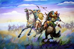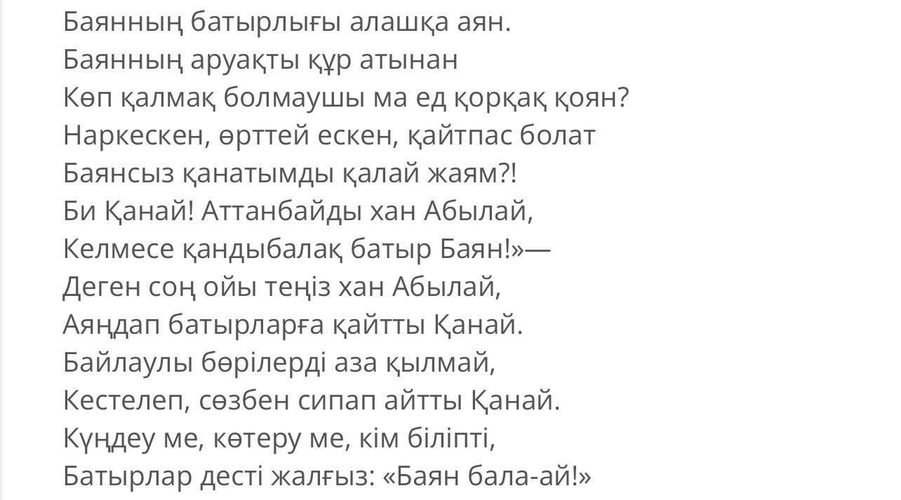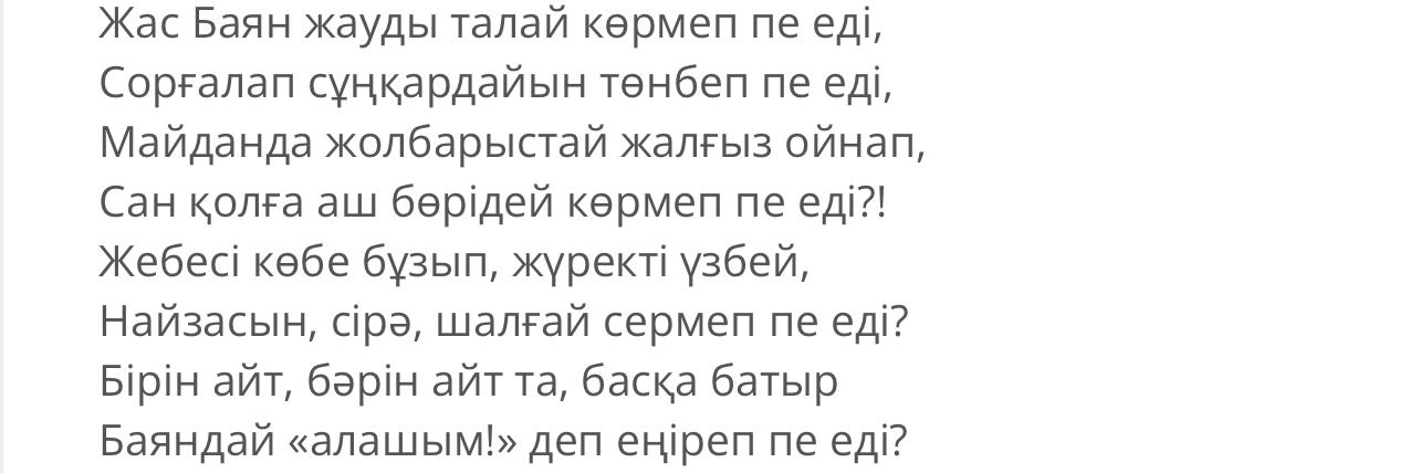 Жас Баян жауды талай көрген еді, Сорғалап сұңқардайын төнген еді. Майданда жолбарыстай жалғыз ойнап Сан қолға аш бөрідей кірген еді. |