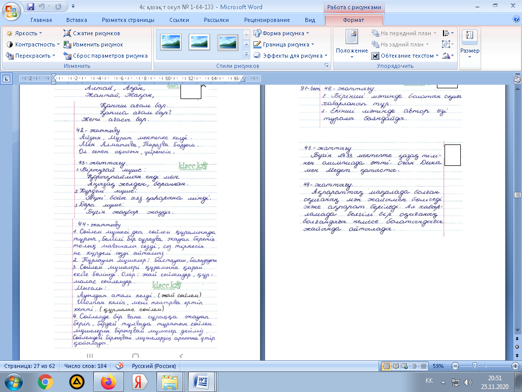 Берілген сұраққа жауап беріп, тапсырмаларды талапқа сай орындайды. Жұмыс дәптеріндегі жазылым тапсырмаларын орындау. Көршісі дәптердегі тапсырманы тексереді. |