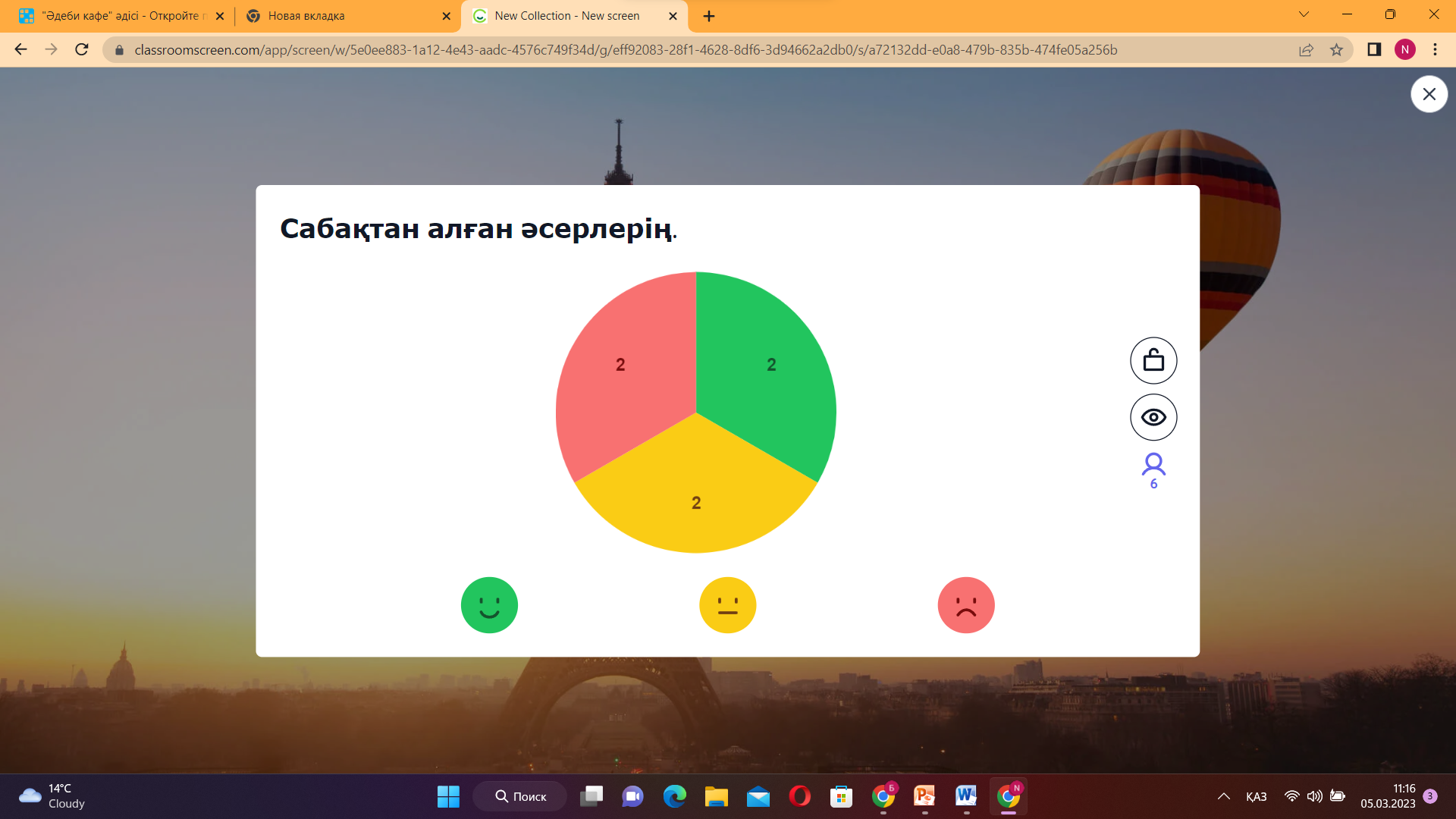 Кері байланыс classroomscreen.com платформасы арқылы оқушылардың бүгінгі сабақтың көңіл күйлерін, сабақты қаншалықты меңгергенін анықтау анықтау