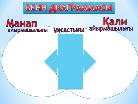 Жеке жұмыс. Венн диаграммасы беріледі. Манап пен Қалиді салыстырып, ұқсастықтарын анықтайды