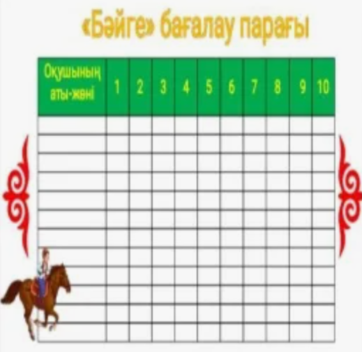 Интербелсенді тақтаның көмегімен рефлексия жасайды. Бәйгеге түскен оқушылардың ішінде мәреге жеткендері баллдық жүйемен бағаланады. |