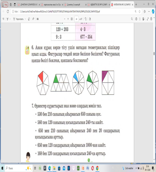 Жаңа тақырыпты меңгереді Тапсырманы орындайды Есептерді шығарады Есепті шығарады. Тапсырманы орындайды Есепті шығарады Есепті шығарады Жұптық жұмыс жасайды Есепті шығарады Ойын ойнайды Тапсырманы орындайды
