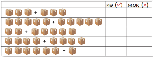 Оқушылар заттардың массасын жазады. Қауын – 5кг+2кг=7кг Қарбыз – 10кг Асқабақ – 3кг+2кг=5кг Қырыққабат – 2кг+1кг+1кг= 4кг Оқушылар әрбір қатардағы қораптардың массасын анықтап, оны 8 килограммен салыстырады. 1кг+1кг+1кг+1кг+1кг +1кг=6кг 6кг<8кг (иә) 1кг+1кг+1кг+1кг+1кг+1кг +1кг+1кг+1кг+1кг=10кг 10кг>8кг (жоқ) |