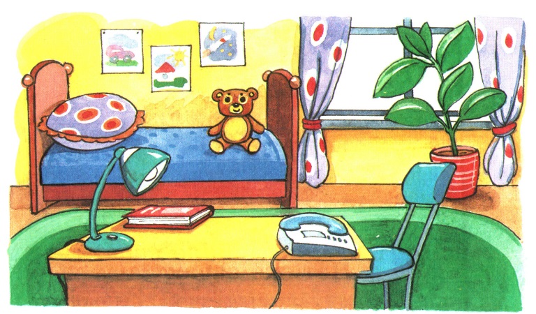 Бөлме-комната Жарық-светлый(-ая,-ое) Пәтер-квартира Жатын бөлме-спальня Терезе- окно Есік-дверь Еден-пол Заттар-вещи Үстел-стол Теледидар-телевизор Кілем-ковер |